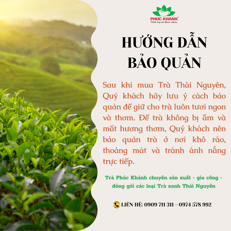 Sau khi mua Trà Thái Nguyên, Quý khách hãy lưu ý cách bảo quản để giữ cho trà luôn tươi ngon và thơm. Để trà không bị ẩm và mất hương thơm, Quý khách nên bảo quản trà ở nơi khô ráo, thoáng mát, tránh ánh nắng trực tiếp, cột kín miệng túi trà.